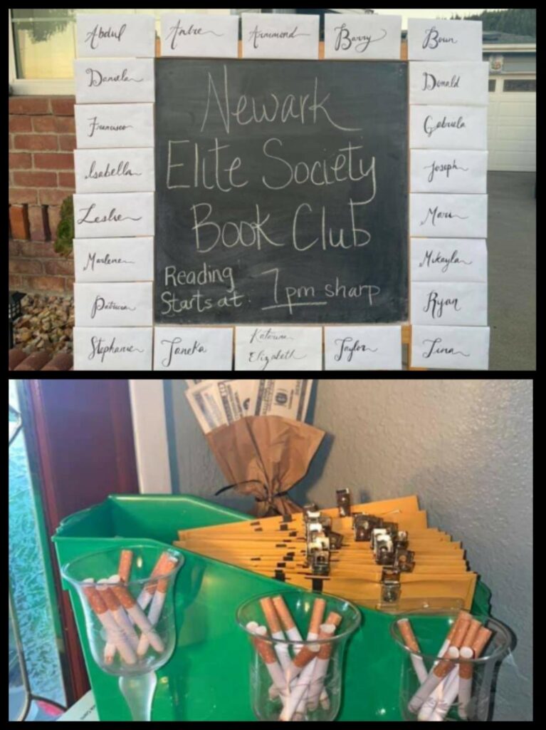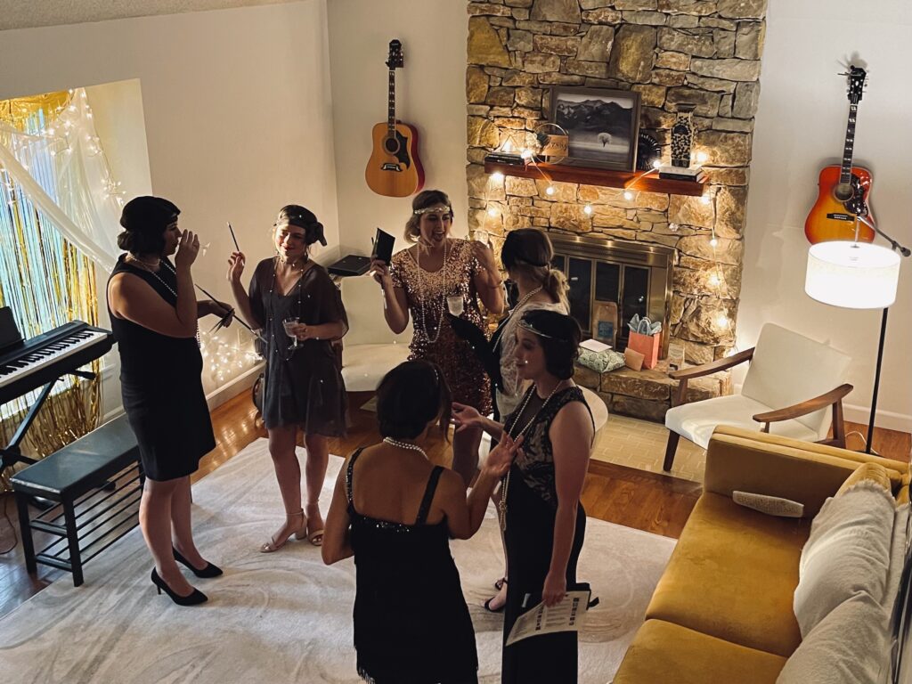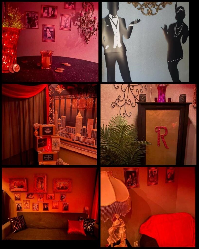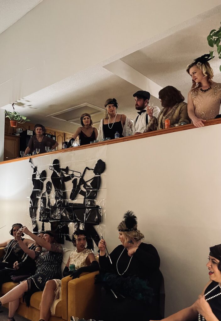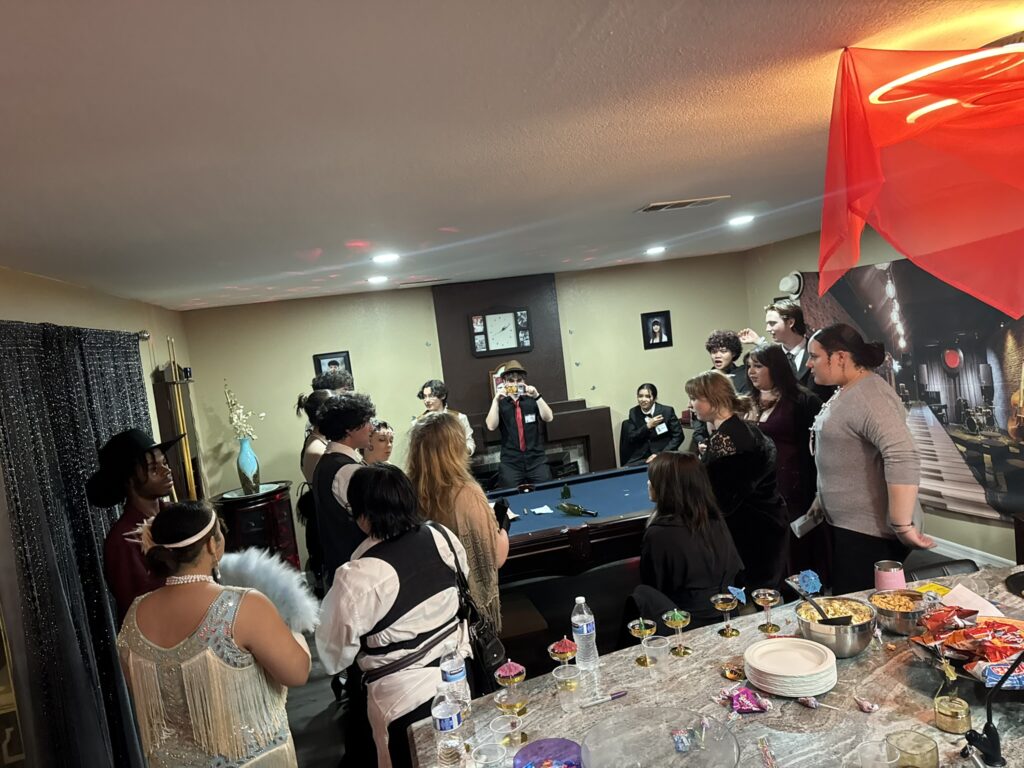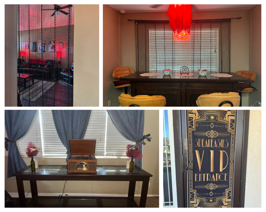 Theme Highlights The absolute best part of the party was the 1920s jazz theme! It created such a fun, welcoming atmosphere for both highschool sophomores and seniors, making it easy for everyone to step out of their comfort zones—even with teens they didn’t know. Since everyone chose their own characters, the roles naturally mixed across age groups. That meant things like sophomores being “married” to seniors or seniors having dramatic storylines with younger sophomores. Situations like that could easily make teens feel awkward or hesitant, but that wasn’t the case at all. Every single guest fully committed to their character. No one paid attention to friend groups or age differences the entire night. You would’ve thought they had all known each other for years. They embraced the theme so completely that nothing held them back from having fun and diving into the experience. As a mom, it was truly incredible to watch—and honestly, something I don’t think any of us will ever forget. Quick note on decorations: My daughter wanted an authentic Speakeasy feel. She didnt want a single birthday decoration. So we simply used Shein and Amazon to buy 20s Jazz decor to make it feel/look like a 20s Jazz Club.