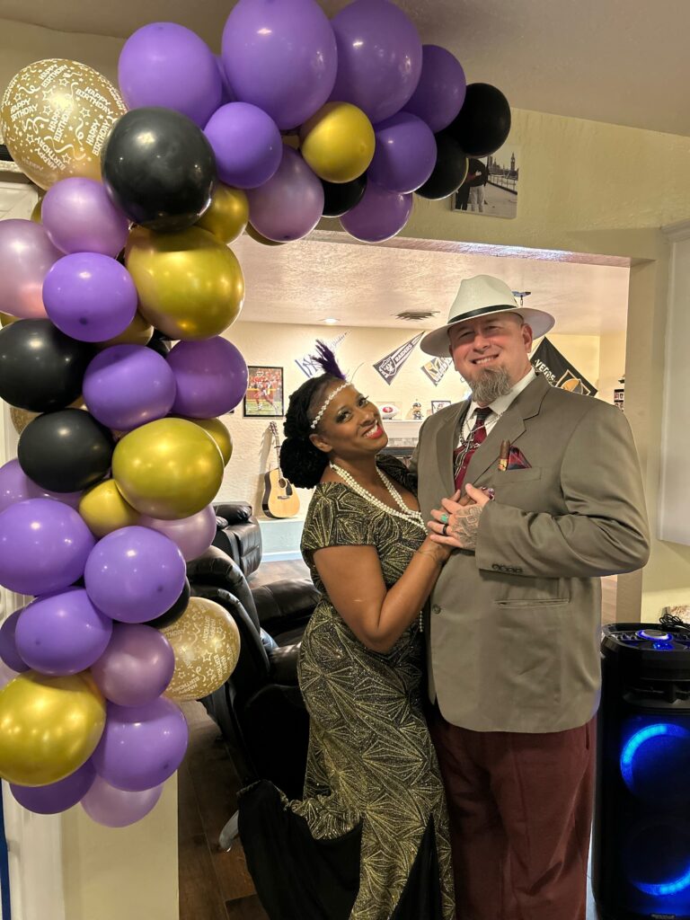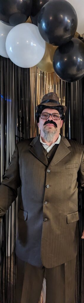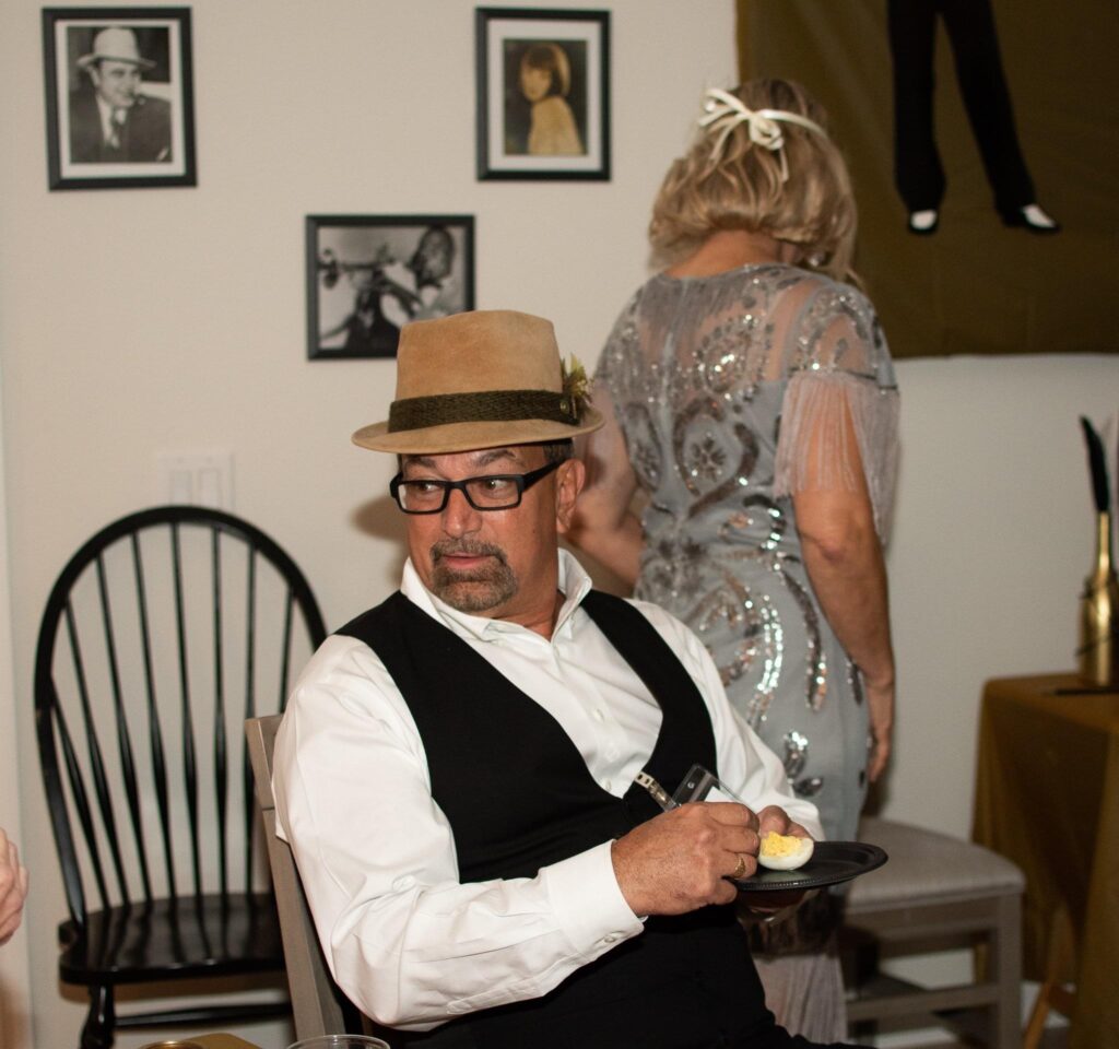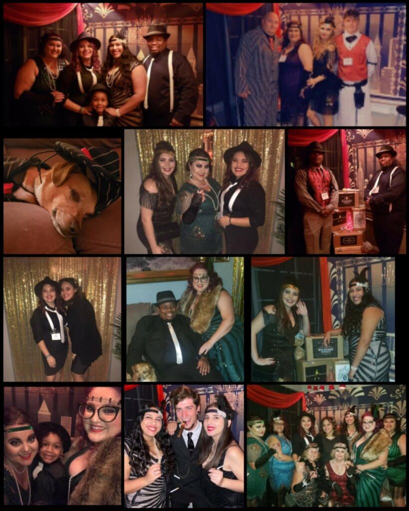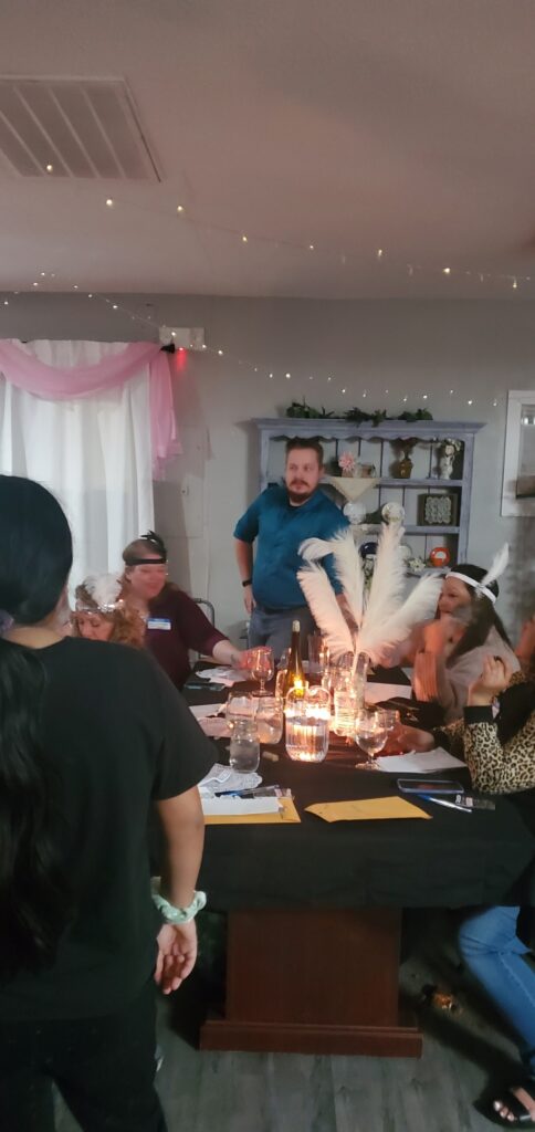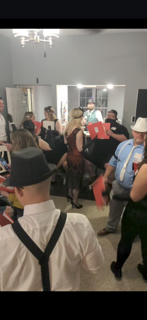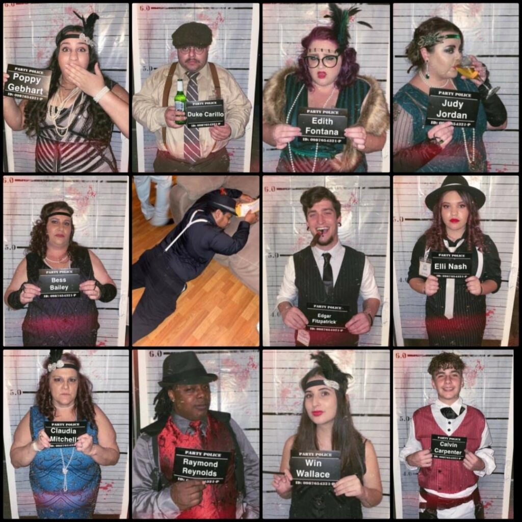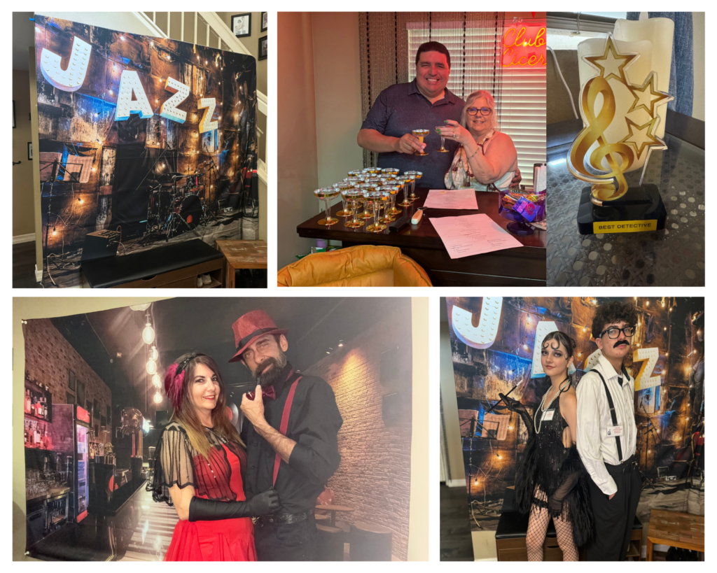 WOW! I have thrown murder mystery parties before, but this one was the best. Yes, it was more advanced that previous ones but everyone that I talked to that has went to others say they liked this one the best because it was mostly improv. Here is how the night went. I blocked the front door with police tape and prohibition signs and drew chalk arrows leading to the backyard. Once in backyard they heard the Jazz audio and picked up their manilla envelope with their homemade police board. I bought a few packs of large and small manilla envelopes at the dollar tree and put nametags on each large envelope this included their character sheet, guest list, vocabulary. and Act 1 and 2 smaller envelopes, which were labeled not to open until told. Act 1 was just their Act 1 part and Act 2 included their voting sheet. This prevented me from having to hand out items all night. They took pictures as they arrived with their police board in front of a police backdrop. Then I had a second backdrop which consisted of boxes covered in brown paper and homemade liquor signs that I painted with black tea bags and hot water to give them the vintage look. I included a couple wood crates that I filled with bags that looked like they were filled with money, some inflatable tommy guns, some fake money, & black feathers that they could use for props to take their picture with. Then they got to knock at the door. The bouncer (my cousin) cracked the door and asked for the password. They entered and asked for their names (expecting only character names for sure). Once they entered, they hung out at maybe had a drink, while I served appetizers. There was a casino set up in the living room (which was just a table covered with a green table cover and some cards and chips put out) The music inside with a YouTube playlist I created to reenact live music being played. Once everyone arrived, I stood on the stage and with the microphone announced Act 1 was about to start and open their Act 1 envelope, read it, and start your roles. As they completed their act one, I served dinner. As Act 1 ended, I took the victim in the backyard and told him of his fate. He laid on a white sheet that we dripped blood on (he was wearing a really nice suit he didn’t want dirty or stained) and went inside and had Poppy disclose what happened. After everyone had a chance to view the crime scene, I had the victim walk around to our 2nd back door and change to the detective. I bought a trench coat, detective hat, magnifying glass, gloves, and a pipe. Once he was ready, I announced that the investigator has arrived and would like to talk to us. He took the microphone and made his announcement. So we started to search for clues. The clues were hidden in little treasure chests that I found on amazon. Once all the clues were found, Interrogations took place. That was fun! Everyone had a blast with it. After the questioning I asked everyone to vote and hand me their voting sheet. I took to the other room to tally the votes while I asked them to discuss their reasoning. I then served dessert, Once I was done, I bought the awards. I bought little grammy like plastic trophies on amazon and put stickers with the title on each one. I stood on stage and started to announce the winners. When lastly, the murder wasn’t guessed, I asked the real murderer to come forward and explain himself. Once he was done I announced the murder mystery is over. Everyone cheered as it was a BLAST!!! Everyone is already asking what is going to be next years theme.