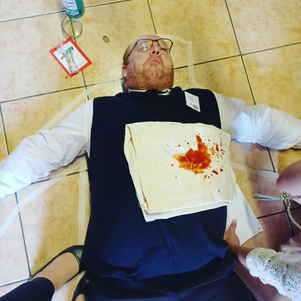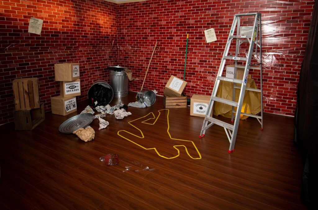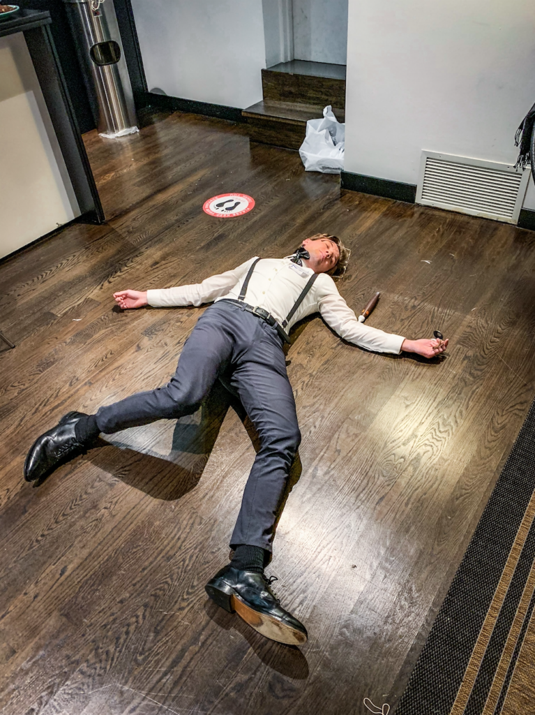 Act Two will begin with the grisly discovery of the victim’s bloody body. In the area around the body, there are signs of the struggle that occurred prior to the death. It will now be up to the guests to figure out what happened.