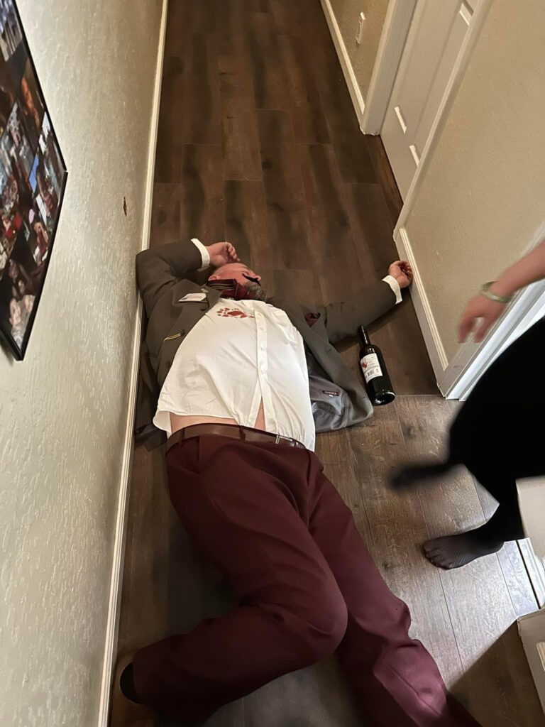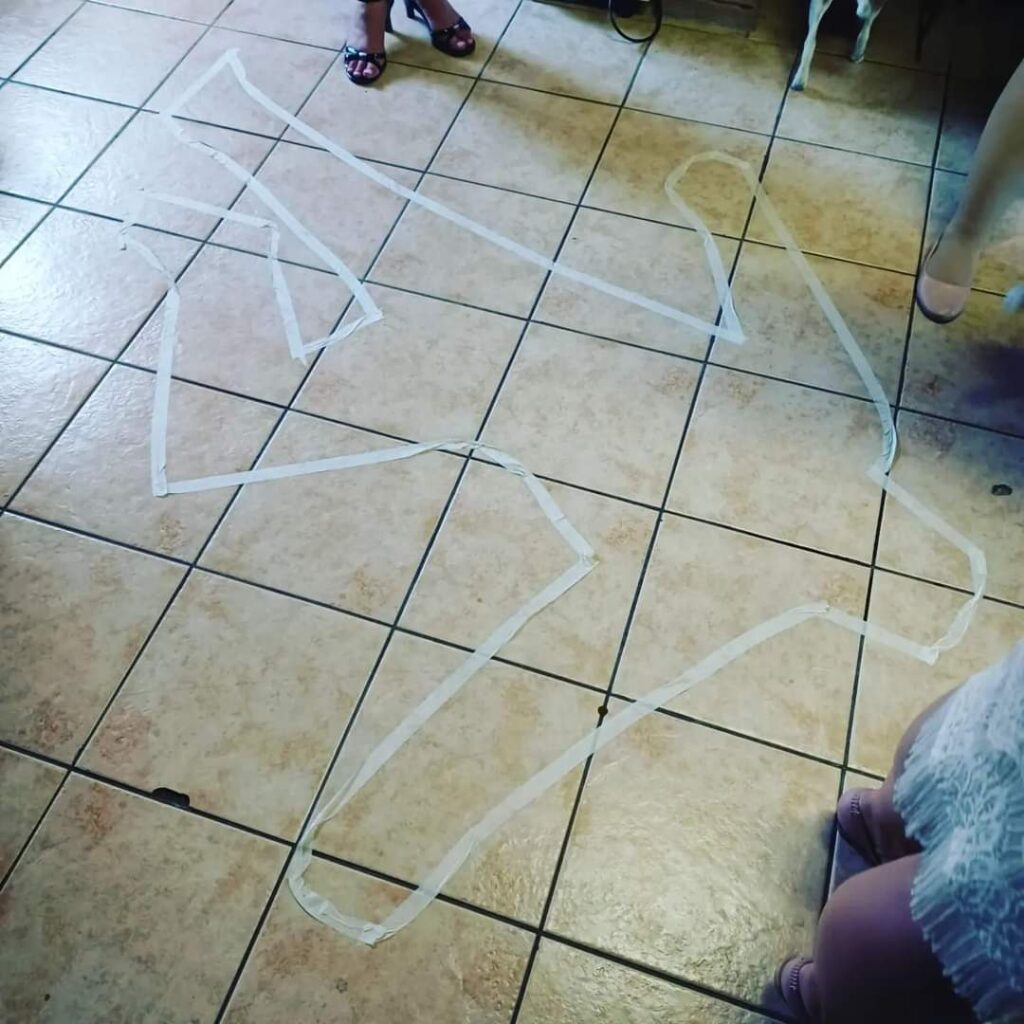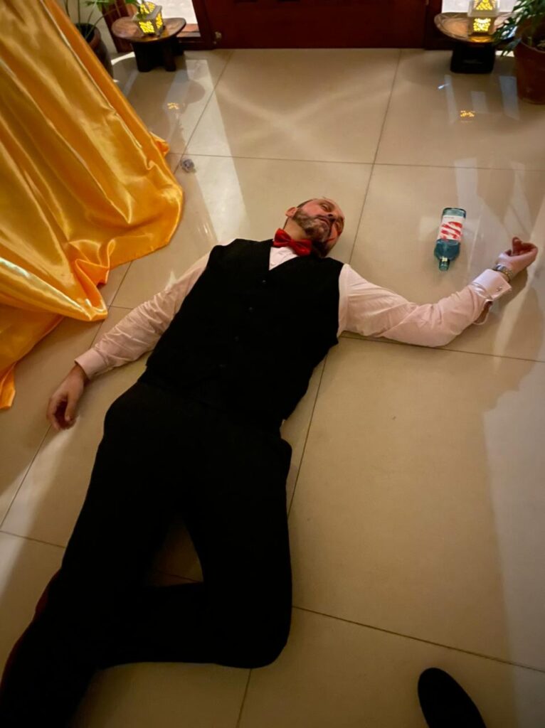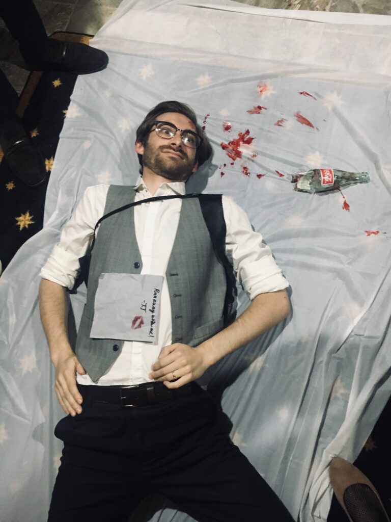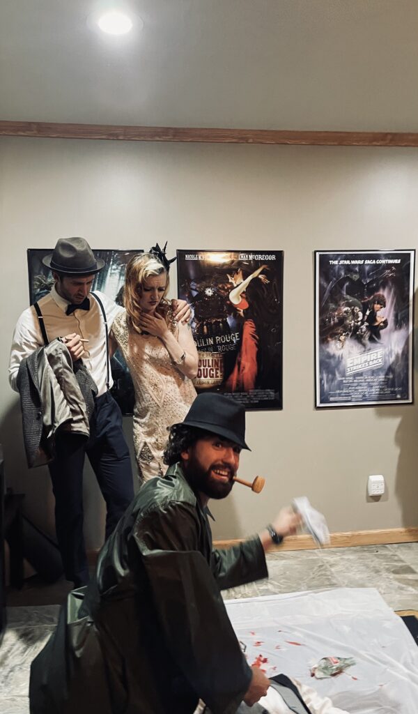 During Act 1, my only responsibility as the host was to read the welcome letter and then observe while everyone played their roles. I kept an eye on the timing to cue intermission. During the break, I hid the evidence props while everyone was outside eating, which made things easy. I did need the “victim” to sneak inside, so I had them excuse themselves to use the bathroom, then lie down in place. I quietly signaled another player to come in and “discover” the body. When they ran out to announce it, that became the cue to end intermission and begin Act 2.