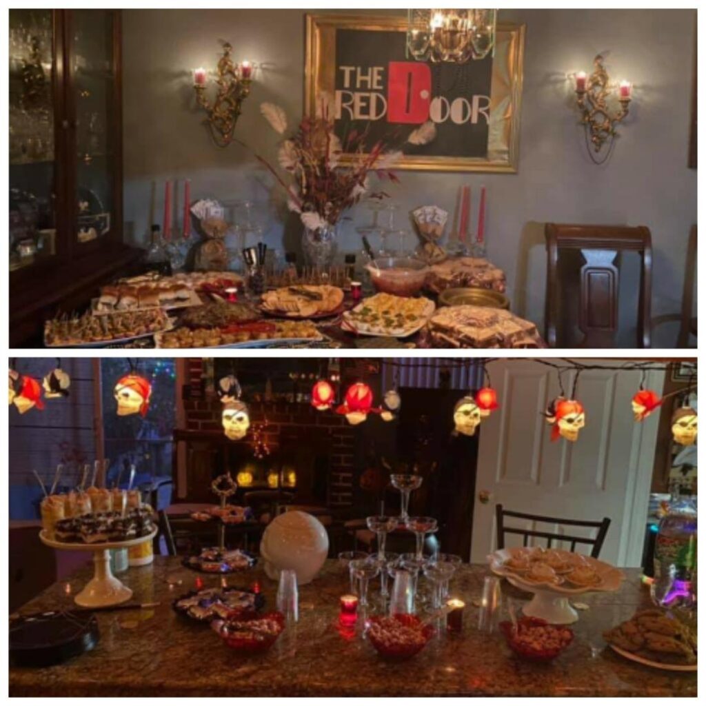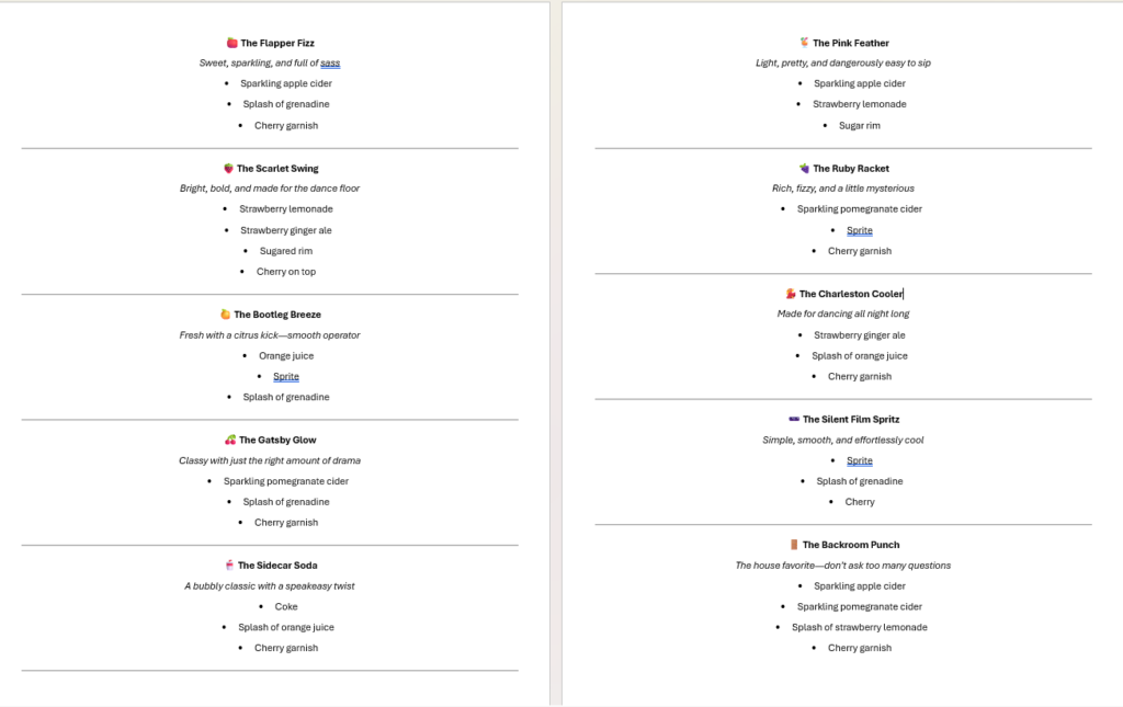 Menu Highlights Since I was hosting teens, I kept the food simple with a variety of fun, teen-friendly options. However, since the theme was a “speakeasy,” the highlight of the night was definitely the mocktails! I actually used ChatGPT to help create a custom drink menu—I asked for a 1920s jazz-themed mocktail menu with fun names and provided a list of the ingredients I had on hand. It generated 10 creative drink ideas, and they were a huge hit. Every single teen loved them! In case you need ideas, here they are: 🍎 The Flapper Fizz Sweet, sparkling, and full of sass • Sparkling apple cider • Splash of grenadine • Cherry garnish ________________________________________ 🍓 The Scarlet Swing Bright, bold, and made for the dance floor • Strawberry lemonade • Strawberry ginger ale • Sugared rim • Cherry on top ________________________________________ 🍊 The Bootleg Breeze Fresh with a citrus kick—smooth operator • Orange juice • Sprite • Splash of grenadine ________________________________________ 🍒 The Gatsby Glow Classy with just the right amount of drama • Sparkling pomegranate cider • Splash of grenadine • Cherry garnish ________________________________________ 🥤 The Sidecar Soda A bubbly classic with a speakeasy twist • Coke • Splash of orange juice • Cherry garnish ________________________________________ 🍹 The Pink Feather Light, pretty, and dangerously easy to sip • Sparkling apple cider • Strawberry lemonade • Sugar rim ________________________________________ 🍇 The Ruby Racket Rich, fizzy, and a little mysterious • Sparkling pomegranate cider • Sprite • Cherry garnish ________________________________________ 💃 The Charleston Cooler Made for dancing all night long • Strawberry ginger ale • Splash of orange juice • Cherry garnish ________________________________________ 🕶️ The Silent Film Spritz Simple, smooth, and effortlessly cool • Sprite • Splash of grenadine • Cherry ________________________________________ 🚪 The Backroom Punch The house favorite—don’t ask too many questions • Sparkling apple cider • Sparkling pomegranate cider • Splash of strawberry lemonade • Cherry garnish ________________________________________ 🖤 The Midnight Mobster Dark, smooth, and a little dangerous • Coke • Splash of grenadine • Cherry garnish