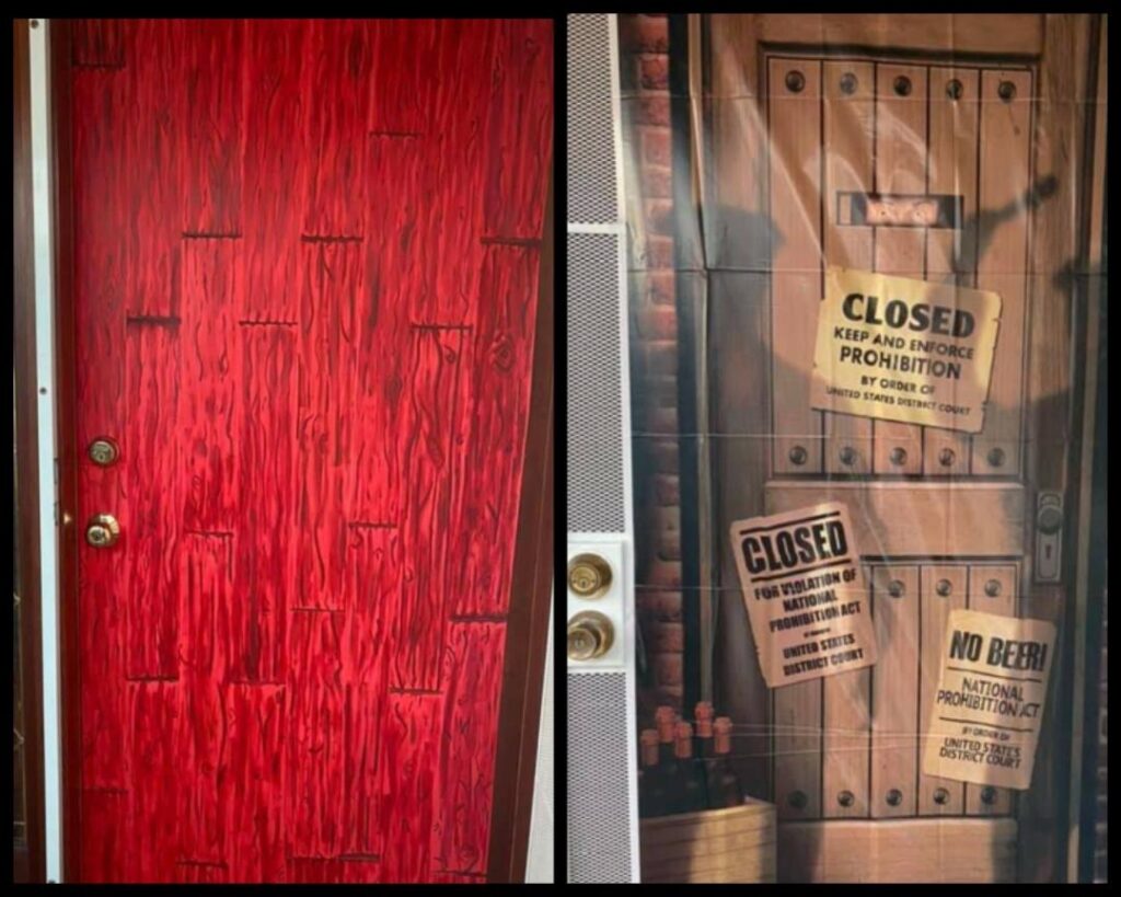 Theme Highlights We followed the script but made a few changes. The biggest was we changed the name of the club to "The Red Door". The front door was red and hidden behind the screen door. The invite said to find "The Red Door". Upon arrival, guests pulled their name to see their character name. You had to have a password to enter. There were 3 passwords for each character. They had to pick one and give the doorman the password. If it was the wrong password they would have to go pick another and try again. Once inside they were given their roles and name tags and got put in the Red Room awaiting the rest of the guests. The red room was a darker room decorated with red lights, black and white photos of each of the guests, boxes with printed labels to look like liquor boxes and a few other decorations. Once everyone arrived the game began and everyone was brought into the dinning area to mingle. We also had a mug shot photo op. 20's music was playing all night in every room.