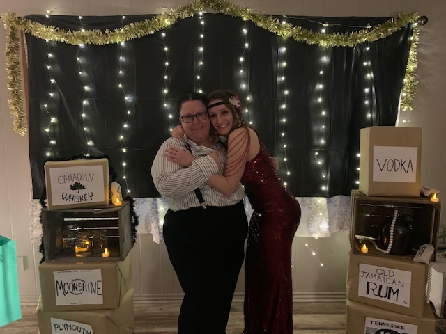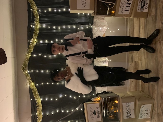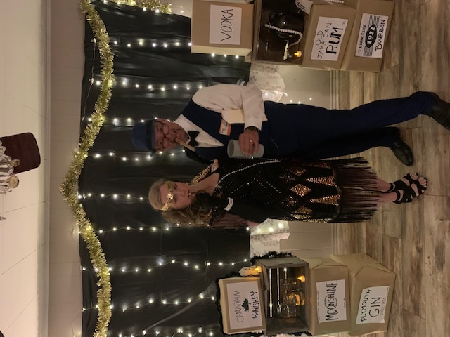 Theme Highlights Everyone came in full costume/attire, and we had a welcome sign for "The Cat's Meow." We were sure to stock the bourbon cart and constantly referred to the secrets of our bootlegging time.