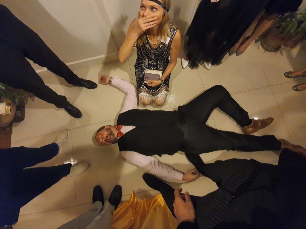 We created a nightclub vibe in the house, glitter and glam, had everyone dress up and followed the directions completely. As it was Halloween we also had some scary skeletons, signs and pumpkin lights around. We created a murder scene with blood, bottles and cases of illegal alcohol.