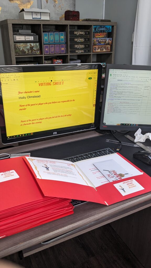 Once the roles were finalized, I printed all the character and game materials, placed them in labeled “Top Secret” envelopes, and had my kids distribute them. One mistake I made was including both Act 1 and Act 2 materials in the envelopes. I didn’t realize Act 2 information was supposed to be handed out during intermission—but it worked out fine. I just asked everyone to hold off on revealing details from Act 2 info sheets, and they did a great job with that.