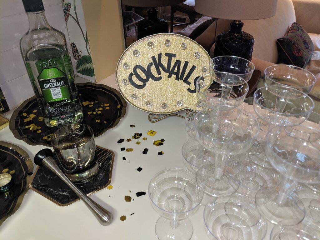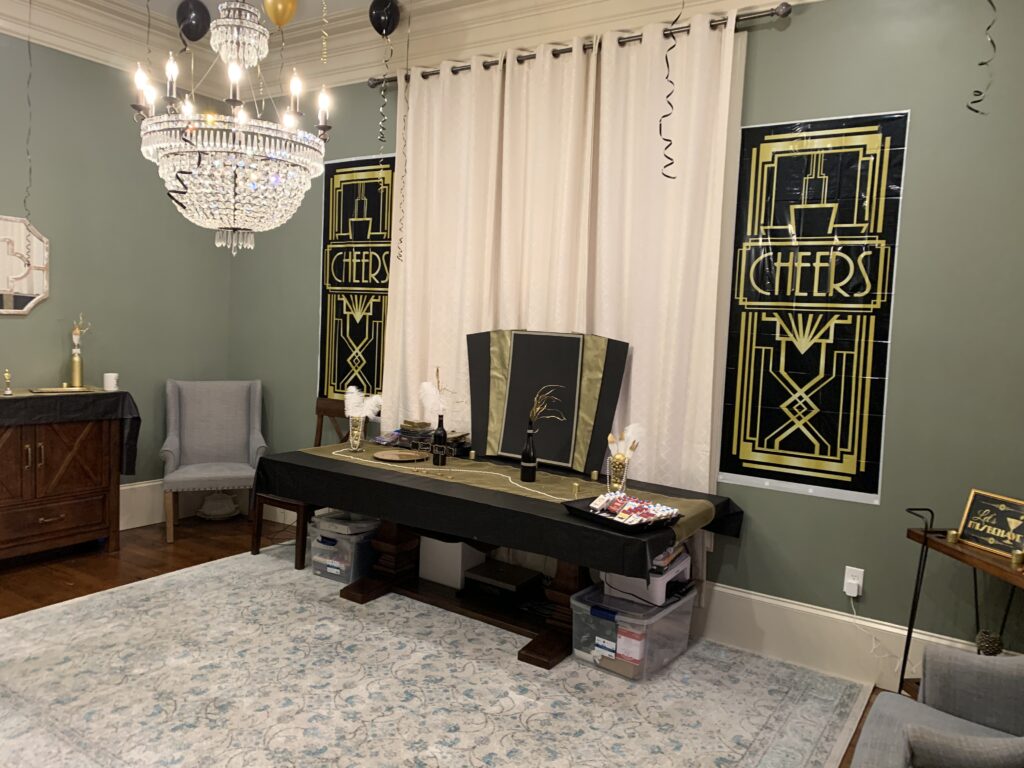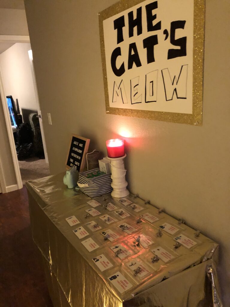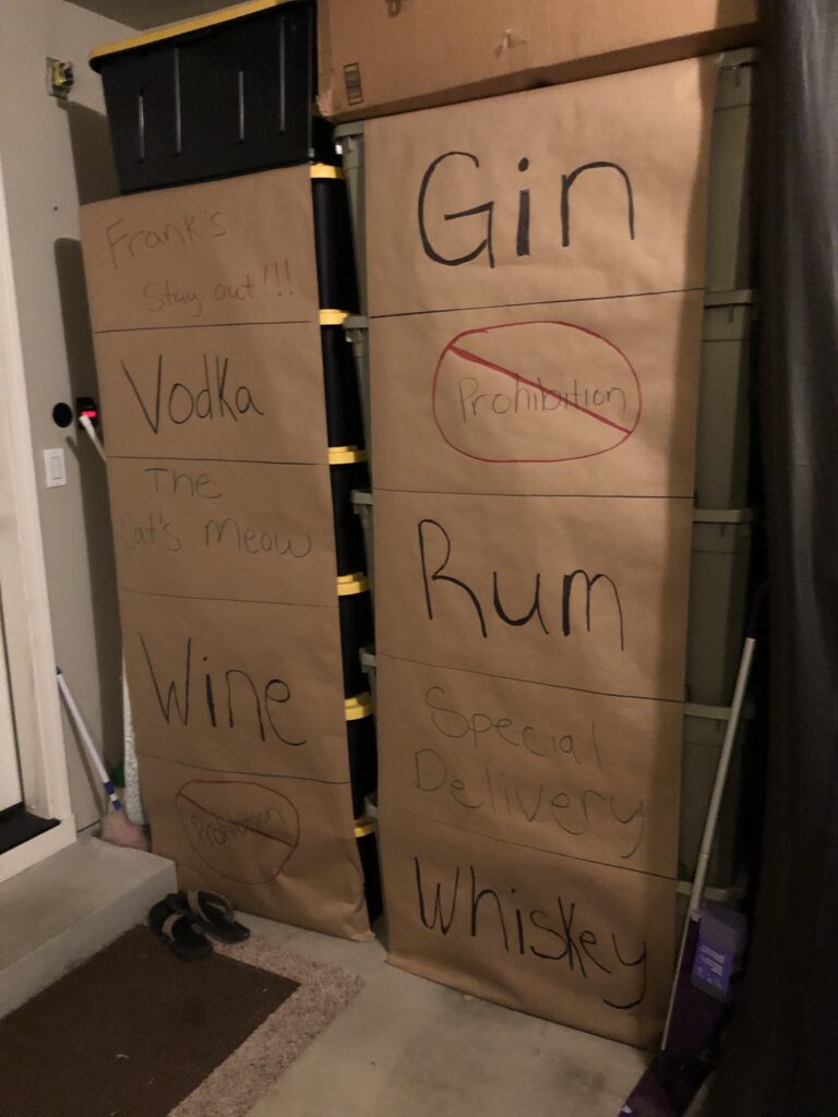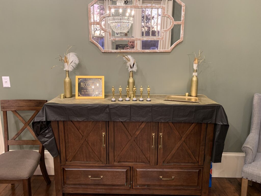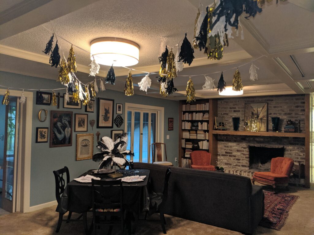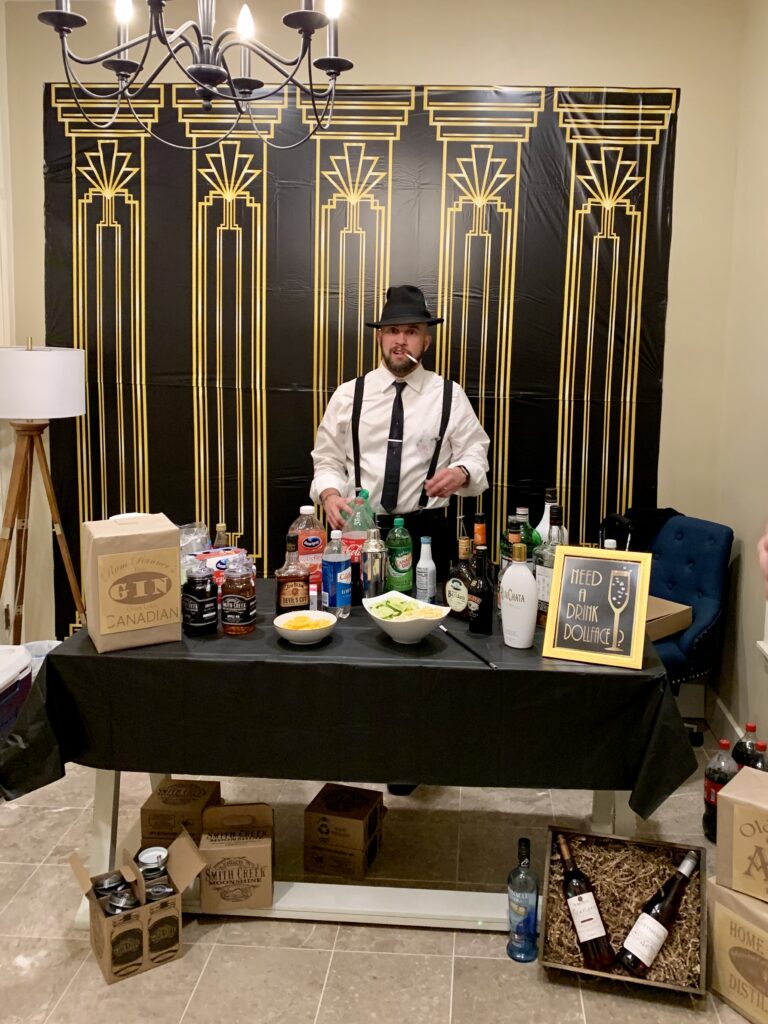 Theme Highlights I got away with the low budget for drinks by using cardboard boxes around the room with labels such as Canadian Whisky or Jamaican Rum. I'd also suggest making anti-prohibition posters and putting them around the room (I put one on the tv screen since I didn't have a place to move it to but it's presence was theme breaking). New-years decorations work well with the theme and so does fake neon-like lights. Raiding dollarama after going on google image for inspiration will help out with ideas. Finally, for music, I used a google home as a speaker as it was less intrusive than any other sound system. Sadly the included sound-track couldn't be played on it, but I found many suitable playlists on spotify by simply searching for 1920s jazz.