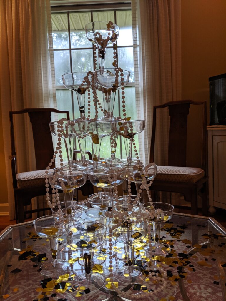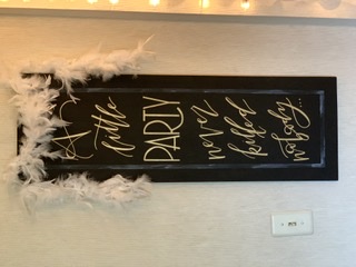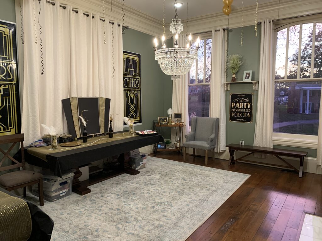 Theme Highlights We decorated with gold and black in the night club area and silver and white in the dining room area. We had 2 backdrops for selfies, there was blackjack and our bartender was behind the bar whipping up the drinks. The dining room was set with china and wine glasses
