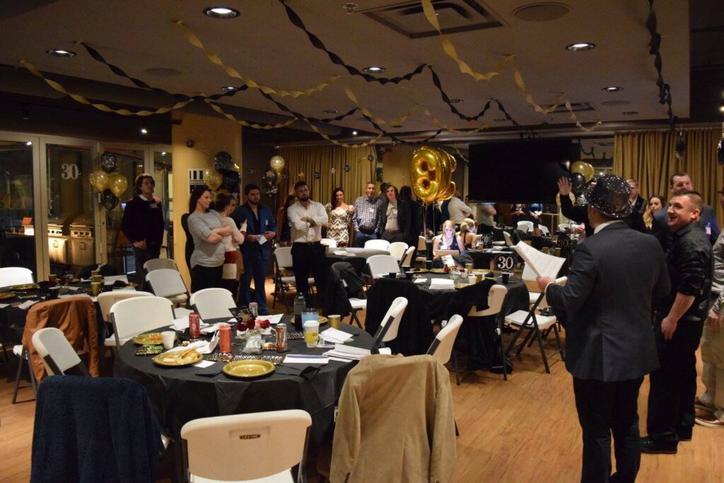 Theme Highlights lots of battery operated candles, black and gold table clothes, confetti on the tables, and plenty of drinks!