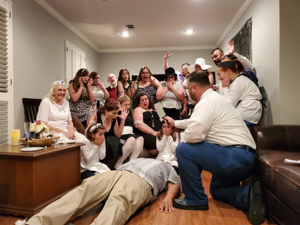 We had approximately 40 guests participate, and everyone dressed according to character. We decorated our home in black and gold decor. Things went smoothly for it being our first time hosting, and everyone seemed to enjoy themselves. The murder, scavenger hunt and clue reveal were definitely the highlights!