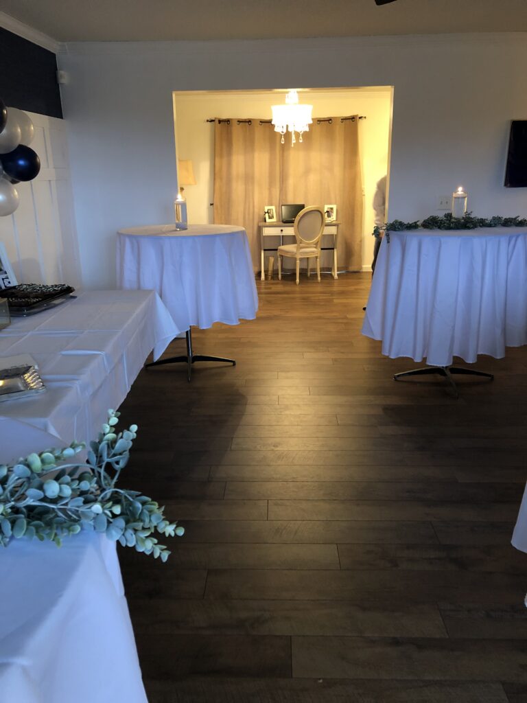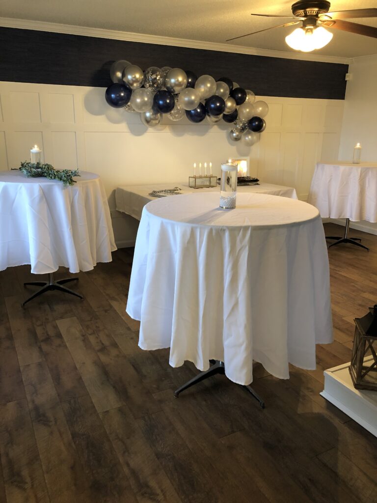 Theme Highlights Theme was black and gold, which included a balloon garland, door fringe and candles. We moved furniture into storage and allowed lots of room for movement.