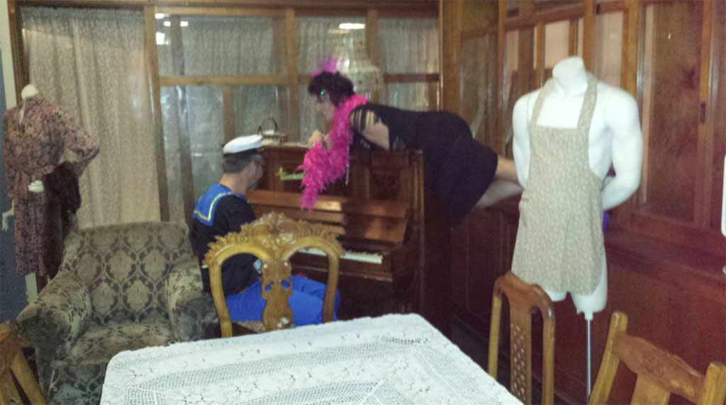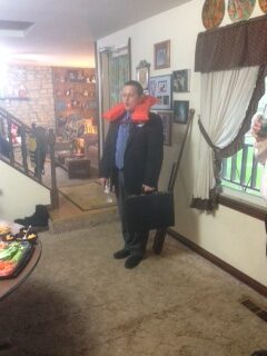 10. Once everyone is downstairs, the Captain blames ‘Sparky’ Thomas (the Ship’s Navigator and Communications Officer – yes, another part) for not warning him about the storm. I come down the basement stairs in a florescent jacket and hard hat blowing a whistle. I tell everyone we are floundering. Captain announces "Man the Life boats!" and the lights go out. Lights up and the victim is dead in a pool of fake blood.