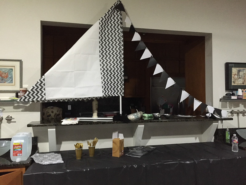 I saw an idea on pin interest that i wanted to implement but didnt know how. My husband came up with the idea of using PVC piping to make the stand for the sail. the black and white sail is in actual fact a paper table cloth and then we found the white and black flags.