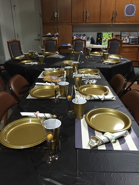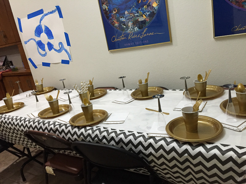 Theme Highlights My son was one of the boat staff, and he played the part well. he had a bow tie and white shirt with server. he actually won the best dressed costume award. I had 4 tables set out. The main characters of the boat sat at the main 2 tables. The main table were for the guests of the Captain Von Ammon. I made everything a black, white and gold theme. I had bought these paper crafts that came 40 in a book. Most people would use them for scrap booking. But they worked perfect for me and it was a nautical theme in the color that I wanted. I found this at Jo-annes. so the table was set with black plastic cloth. then the paper craft. each a different design. the cutlery was in a napkin with a candy bracelet. The idea on pin interest was to use a life savor candy. however life savors are not kosher. so I had to improvise. So the candy bracelet acted as a life ring. gold plates, gold cutlery, gold cups and inside the cup was a gold and white straw. I found most the place settings stuff at party city. the wine cups i actually found at costco and the gold chewing gum ball was at jo-annes. We put it in the cup and it looked cool. the table for my guests who were not part of the mystery but were watching was set differently. still black and gold. the cutlery was placed on the table and the napkins in the glasses with the straws. The Table for the boat crew who were part of the characters but there job was to serve and help was set differently again. The table cloth was the same as the sail - paper cloth. the napkins laid flat, with wine glasses upside down and cutlery in the gold cups. so there was a distinction and difference between the tables There was no indication from the outside. So everyone got a surprise when they walked in. We set the scavenger hunt in the garage. the setting was an island. So I bought from party city, yellow table cloths which come in a roll. so the floor was the beach. as you walked into the garage, on the left wall was the bush, trees. i put the brown and green sheets to cover the junk in the garage. to the back was this picture of the beach, waves and sea. I found this roll and the next one of the waves and under water at Jo-Anne’s. great store to find things you need. The fish were our pool toys that I got this summer for the kids. the boxes and stuff against the wall by the beach sand picture was the scavenger hunt. the ship wreckers would need to find parts to make a boat while others searched for food and water. Which were toy fruits. and placed bottle of water in places. unfortunately we could not get the music to be loud from our computer. but that was the only problem and everyone was fine with it