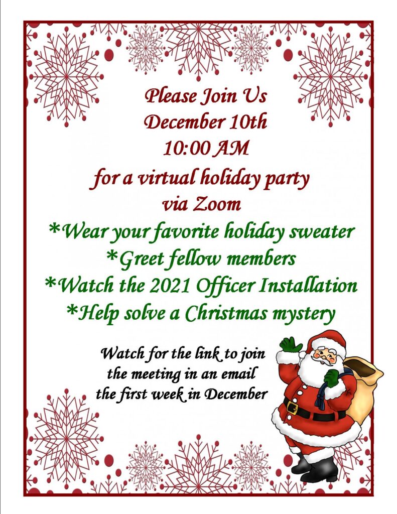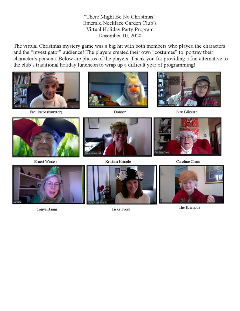 The Emerald Necklace Garden Club’s Holiday Party on December 10, 2020 included the virtual “There Might Be No Christmas” mystery game. It was a big hit with both members who played the characters and the “investigator” audience! The players created their own “costumes” to portray their character’s persona. It was great to have a fun alternative to the club’s traditional holiday luncheon to wrap up a difficult year of programming!