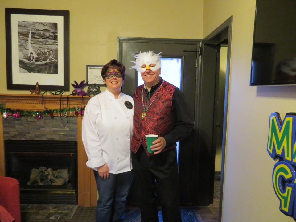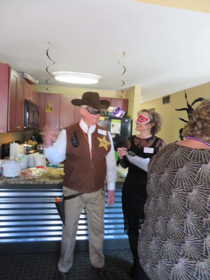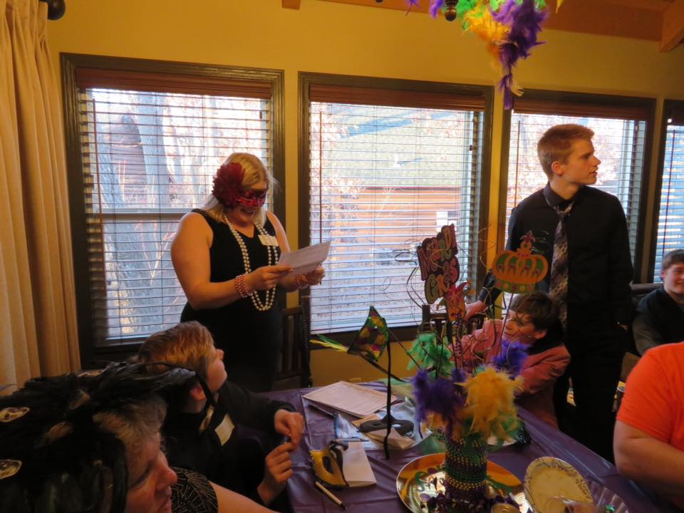 Some of the highlights were center pieces in Mardi Gras colors, chocolates with gold, green and purple wrappers (peanut butter cups, Andes Mints and Hershey kisses). The menu consisted of great items like beer cheese dip with andouille sausage, clam chowder, oven roasted shrimp, jambalaya and a purple Mardi Gras punch.